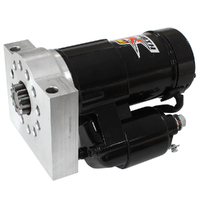 Aeroflow Hitachi style high torque starter motors are serviceable and manufactured from aluminium with a multi-angle mounting block that allows different mounting positions to clear multiple header and oil pan configurations. The 1.4kw / 1.9hp starter is recommended for engines up to 400cu and 14:1 compression ratio and utilizes a 4.44:1 gear reduction. Aeroflow starter motors have high heat resistance and are powder coated black for extra corrosion protection.