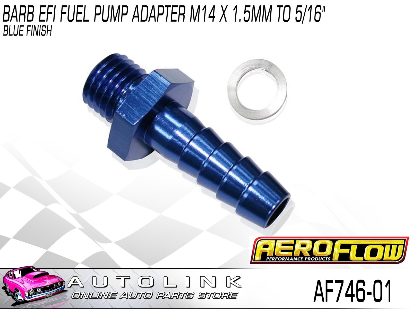 AEROFLOW BARB EFI FUEL PUMP ADAPTER M14 x 1.5mm TO 5/16" BLUE FINISH AF746-01