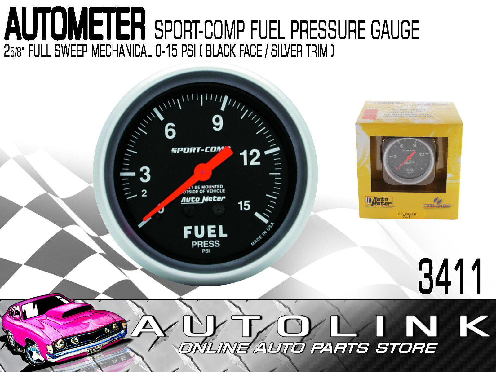 AUTOMETER SPORT-COMP SERIES FUEL PRESSURE GAUGE 2-5/8", FULL SWEEP MECH 0-15PSI
