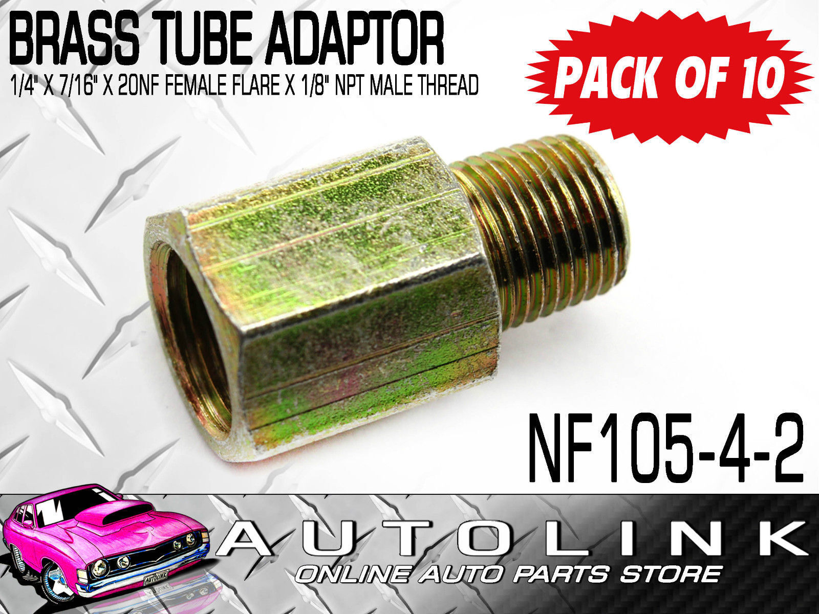 BRASS TUBE ADAPTORS FOR 1/4" BUNDY TUBE 7/16"x20NF FEM FLARE x1/8" NPT MALE x10