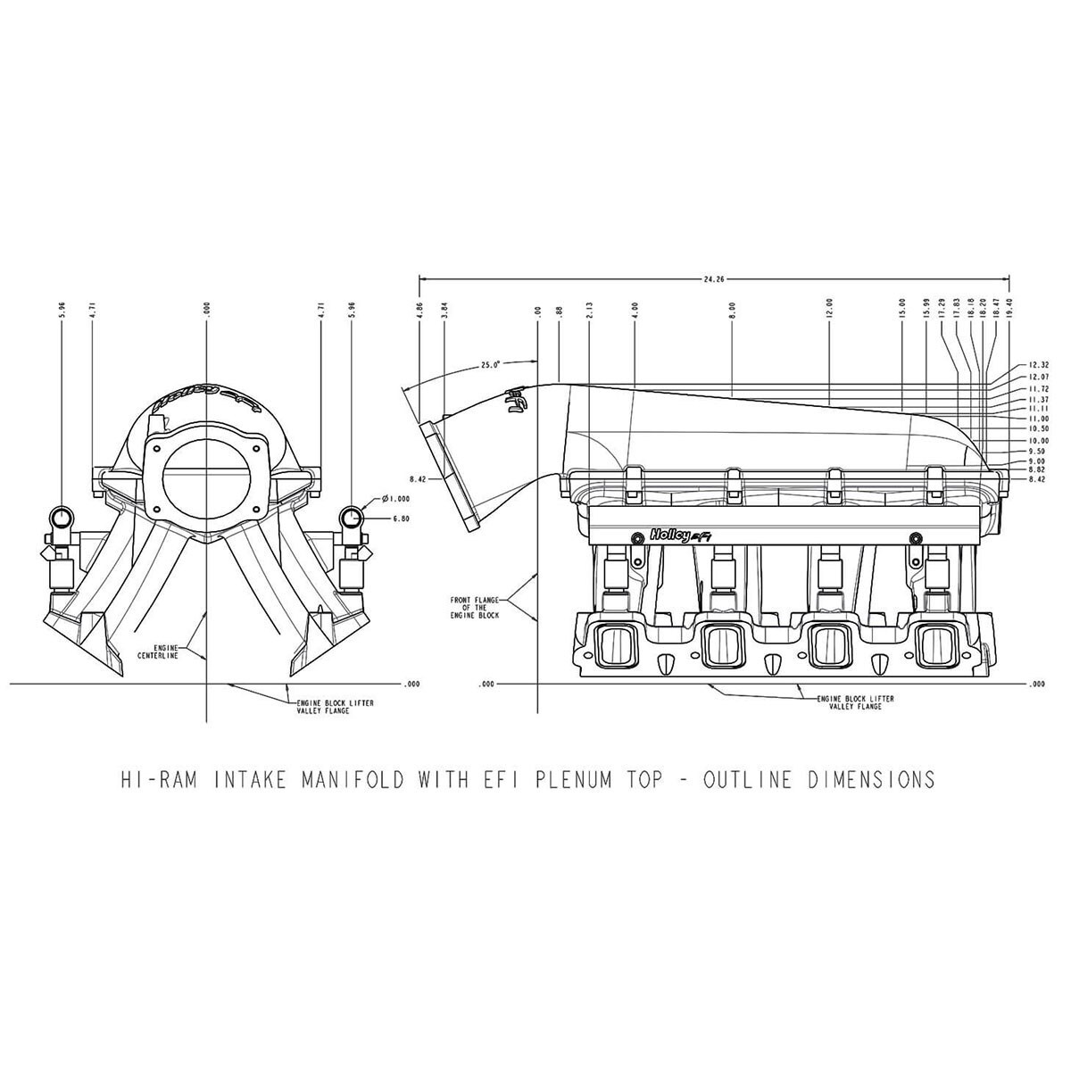 - Total Height with 92/102mm EFI Plenum Top – 12.32” to the lifter valley cover flange on engine block.