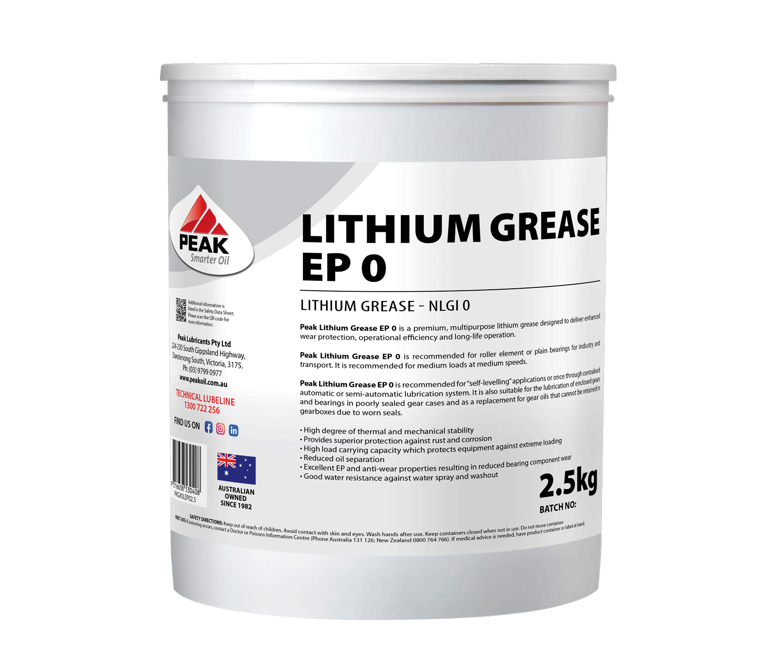 PEAK LITHIUM GREASE EP 0 is recommended for “self-levelling” applications or once through centralised automatic or semi-automatic lubrication system. It is also suitable for the lubrication of enclosed gears and bearings in poorly sealed gear cases and as a replacement for gear oils that cannot be retained in gearboxes due to worn seals.