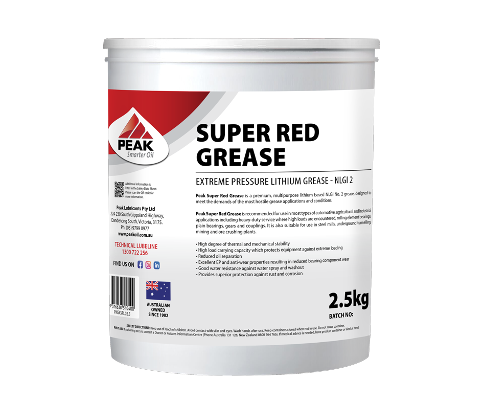 Peak Super Red Grease Recommended for use in most types of automotive, agricultural and industrial applications including heavy-duty service where high loads are encountered, rolling element bearings, plain bearings, gears and couplings. Also suitable for use in steel mills, underground tunnelling, mining and ore crushing plants.