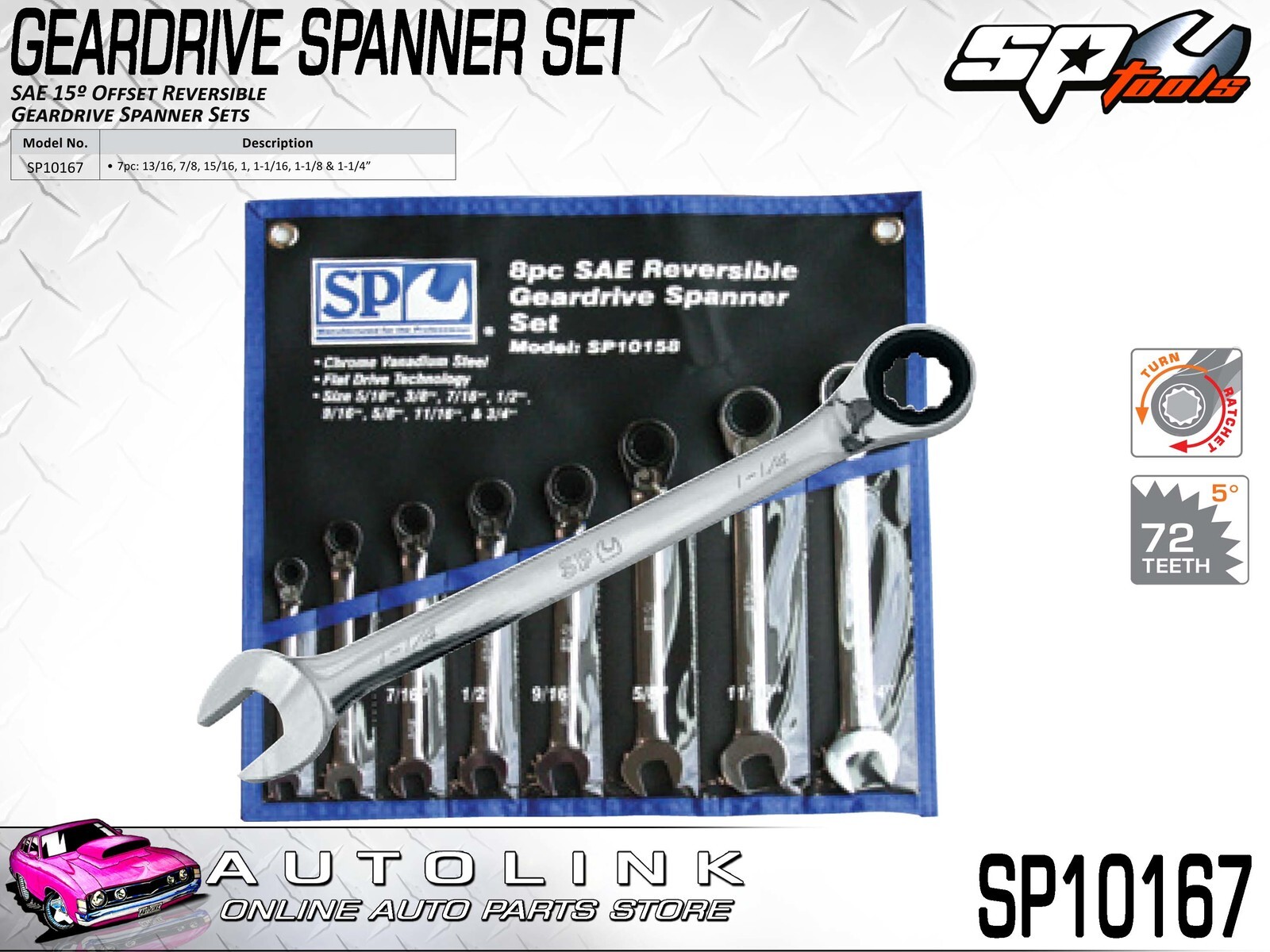SP TOOLS SAE 15° 7PC OFFSET REVERSIBLE GEARDRIVE WRENCH SPANNER SET SP10167