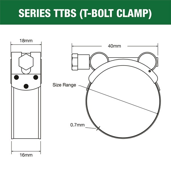 The Tridon TTBS all stainless T-Bolt clamp range provides superior design and proven reliability.