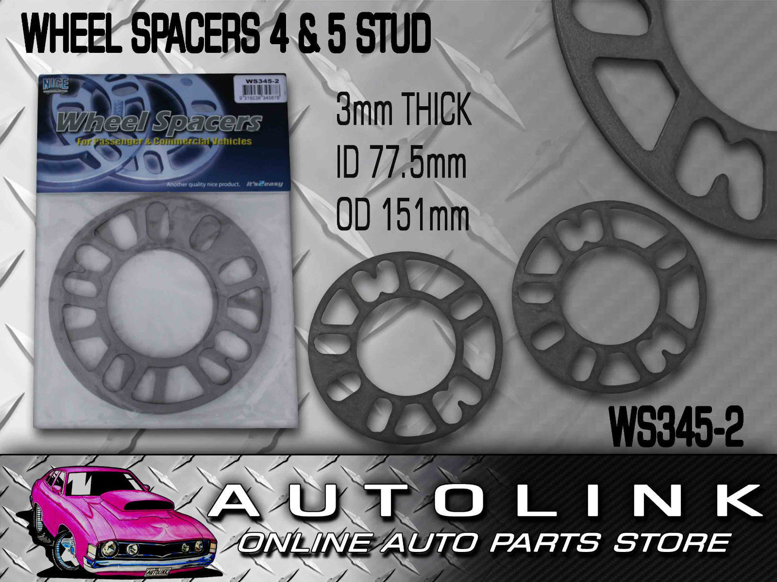 These Universal Fit 4 or 5 stud wheel spacers are 3mm thick with ID 77.5mm & OD 151mm. Will provide extra clearance for brakes and fitting of bigger wheels.