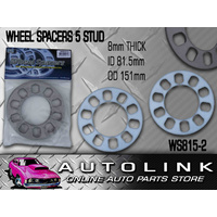 These universal fit 5 stud wheel spacers are 8mm thick with ID 81.5mm and OD 151mm. Will provide extra clearance for brakes and fitting of bigger wheels and tyres.